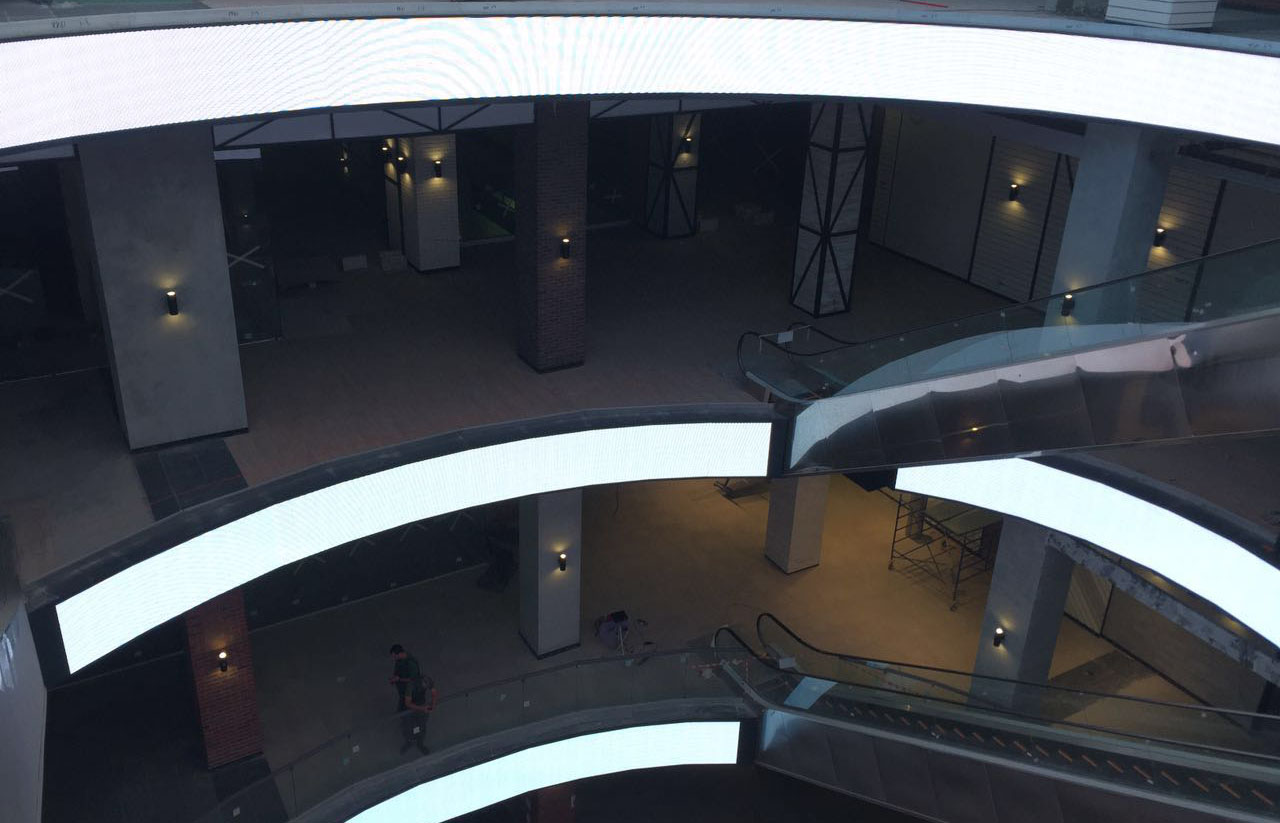 A distinctive feature of this screen is that it was mounted along the radius, since the atrium of the NORA shopping and entertainment center has a rounded shape.